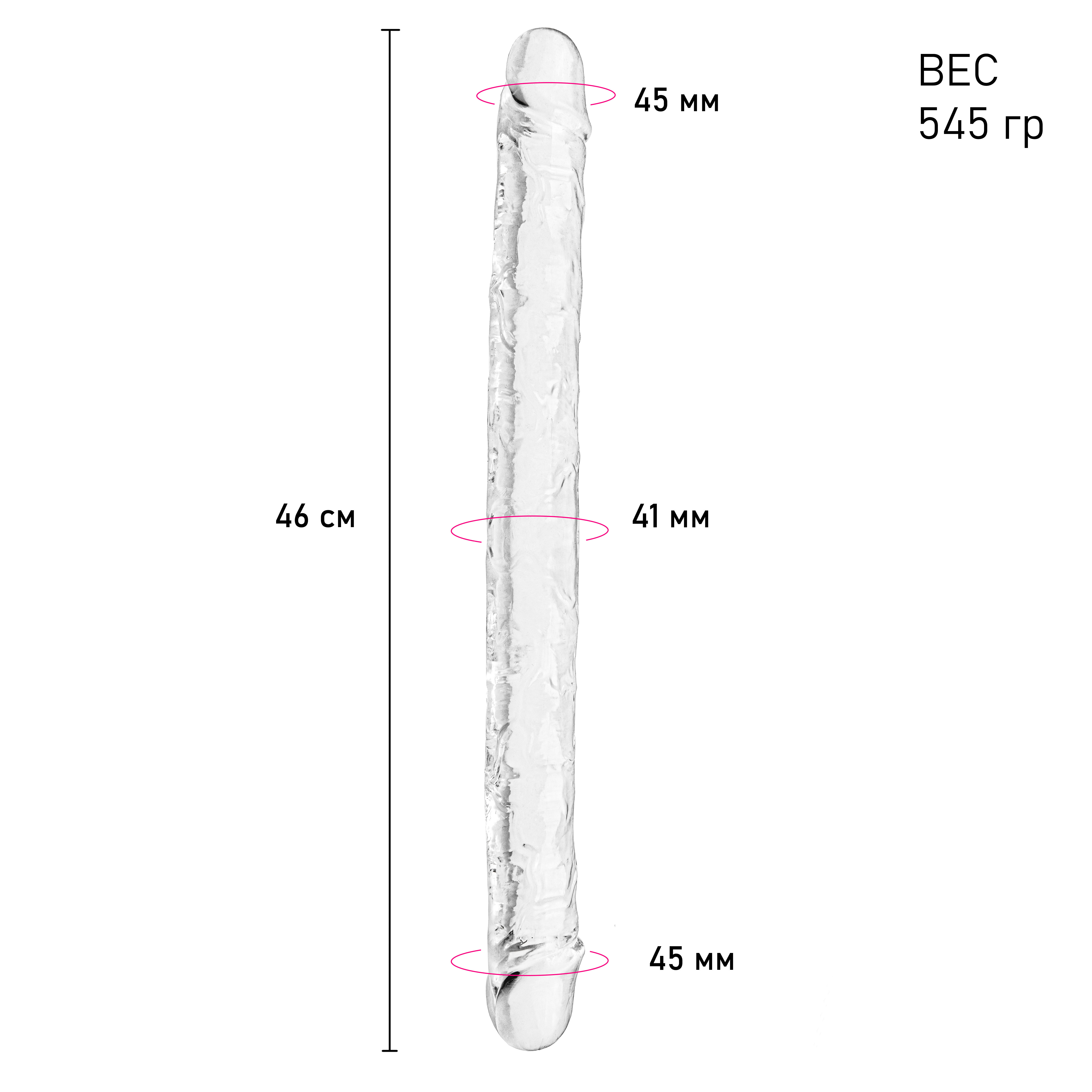 Двусторонний реалистичный фаллоимитатор создан для тех, кому наскучили классические дилдо и кому хочется попробовать нечто новое и открыть новые горизонты сладострастия и сильнейших оргазмов. Фаллос больших размеров подойдет всем без исключения - им можно стимулировать вагину, обеспечивая массаж стенок влагалища и точки G, а так же клитора, подойдет для массажа простаты и двойного проникновения. Секс игрушка не боится влаги и не деформируется от частых использований, благодаря высококачественному материалу. Для наиболее приятных ощущений рекомендуем использовать смазку на водной основе. Фаллоимитатор для женщин выполнен с анатомической точностью - выделена головка, как настоящая, и вены. На выбор предлагается 2 цвета - черный и прозрачный. Общая длина фаллосов - 46 см.
