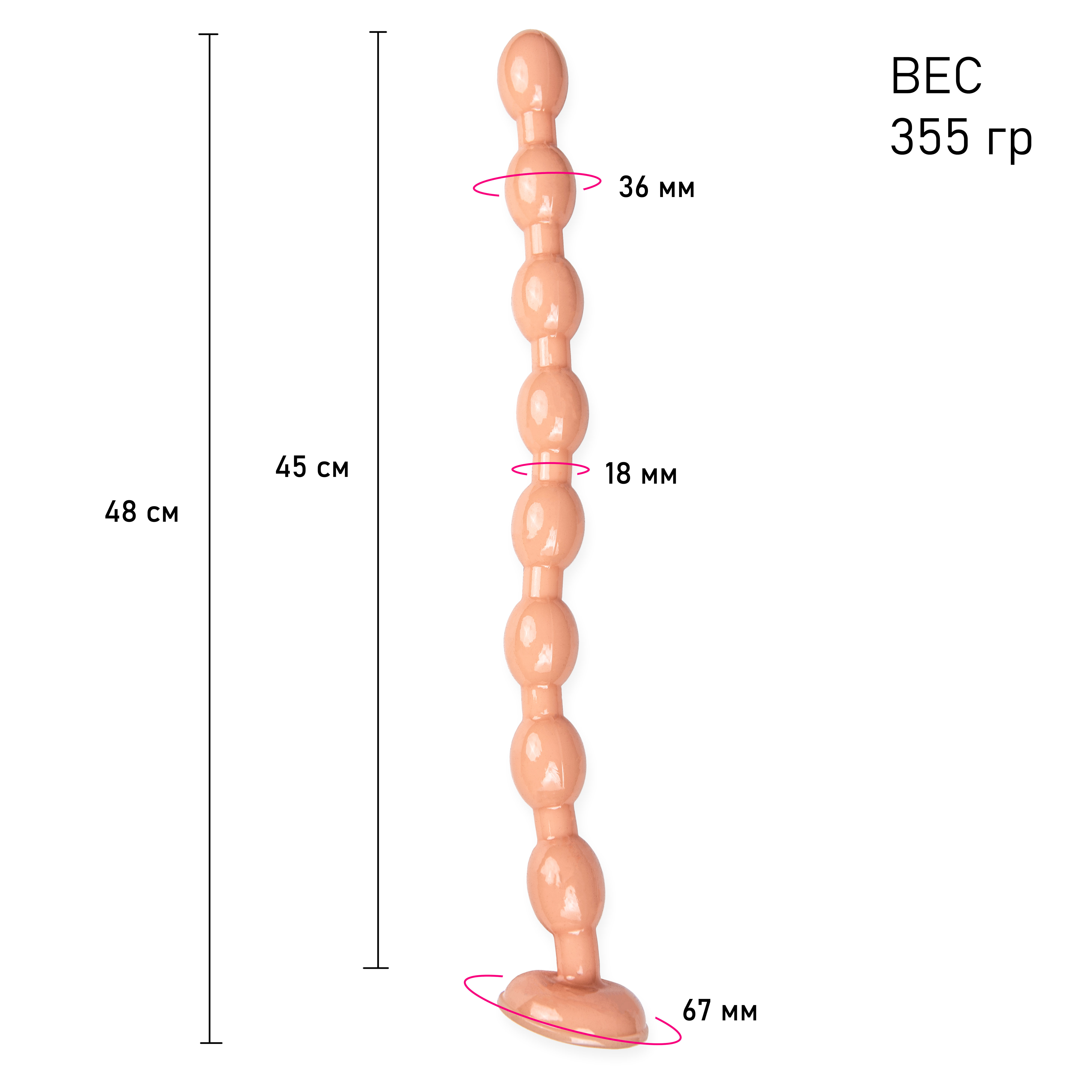 Анальный стимулятор большого размера поможет вам воплотить в жизнь самые смелые сексуальные фантазии. Такая внушительная секс игрушка подойдет скорее профессионалам, чем новичкам из-за ее огромных размеров и необычной рельефной формы с шариками, которая стимулирует анус и простату гораздо интенсивнее, чем обычные анальные пробки, вибраторы для ануса, плаги с хвостом, дилдо и т.д. Для более комфортной и безопасной пенетрации рекомендуется использование смазки на водной основе. Анальный фаллоимитатор 48 см доступен в 2 цветах - черный и бежевый. Благодаря присоске он быстро крепится к любой гладкой поверхности, не важно, горизонтальной или вертикальной. Можно использовать в ванной и душе, т.к. анальные бусы не боятся влаги.