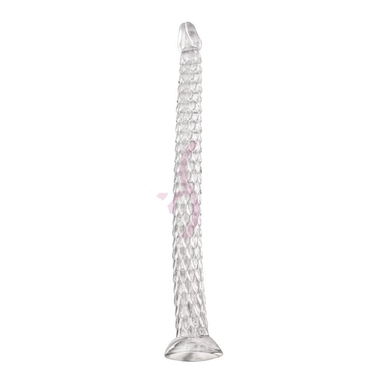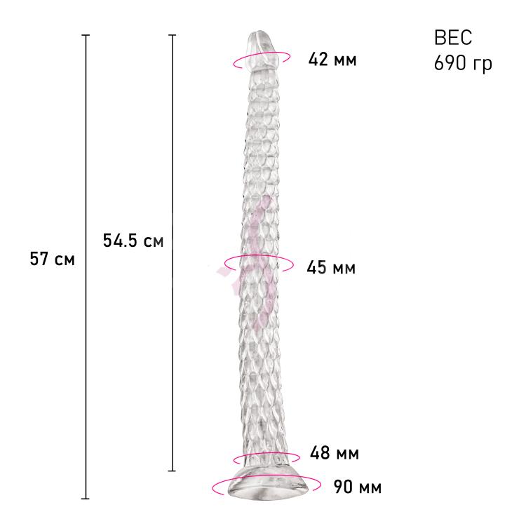 Анальный стимулятор нестандартного большого размера 57,5 см - то, что нужно для тех, кому наскучили привычные секс-игрушки, такие как маленькие анальные пробки и плаги, и хочется покориться чему-то по-настоящему внушительному и притягательному, именно таким предметом является данный анальный дилдо. С помощью большого фаллоимитатора с присоской можно качественно простимулировать простату, чтобы довести себя или своего партнера до ярчайшего анального оргазма. Но рекомендуем обязательно использовать смазку на водной основе для безопасности и более легкой пенетрации в анус. Так же этот длинный фаллос поможет подготовиться к анальному сексу. Покрыт рельефными чешуйками, благодаря которым проникновение будет еще ощутимее. 3 цвета: черный, бежевый и прозрачный.