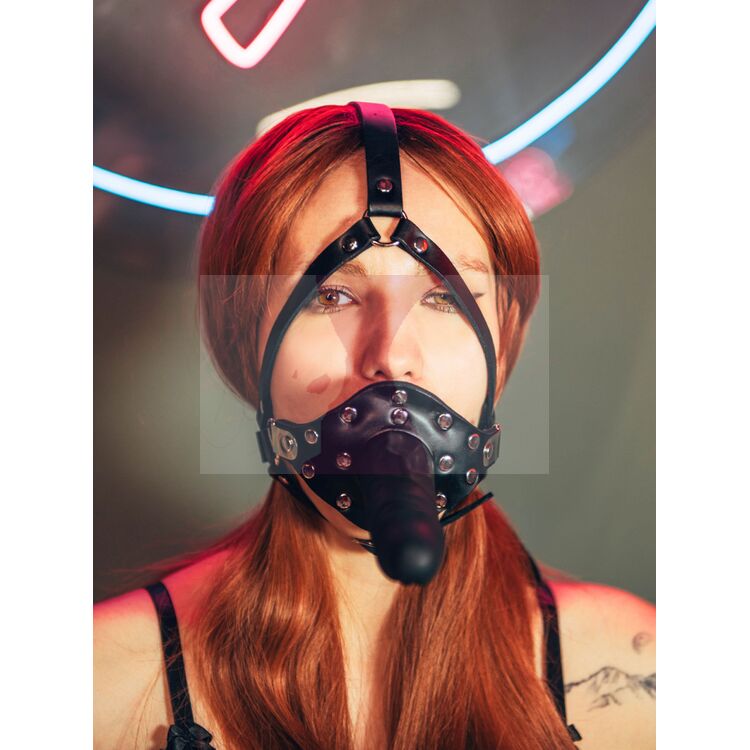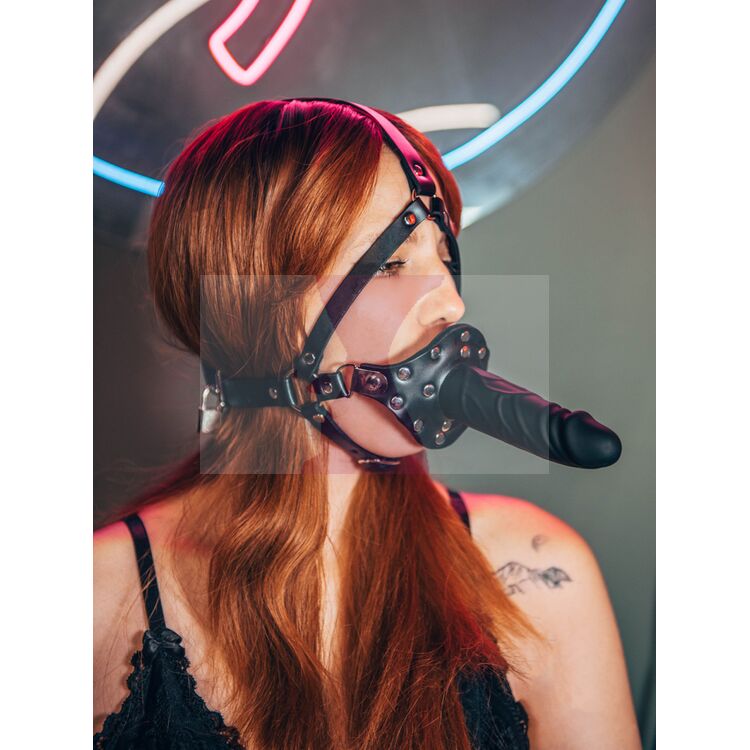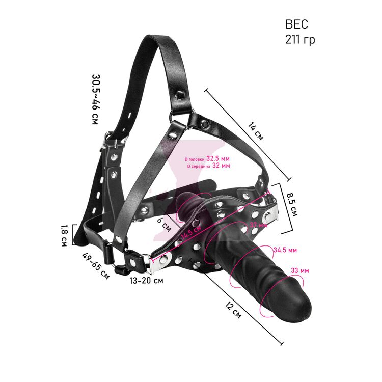 Кляп-страпон - это что-то на волнительном и чувственном! БДСМ игрушка, которая не просто выполняет одну функцию, а напротив, имеет очень широкий и богатый спектр применения. Яркий и головокружительный оргазм с такой секс-игрушкой гарантирован как нижнему, так и верхнему партнеру. Двусторонний кляп крепится на лицо таким образом, что внутренний фаллос небольшого размера помещается в рот, а внешний фаллос можно использовать для стимуляции вагины, точки G или ануса. Сами фаллоимитаторы реалистичны и выполнены со всеми анатомическими подробностями, включая венки на упругом стволе и соблазнительную головку. А стильный черный цвет подойдет под антураж любого БДСМ приключения. Кляп со страпоном оснащен фурнитурой из высококачественного металла, декорирован заклепками.