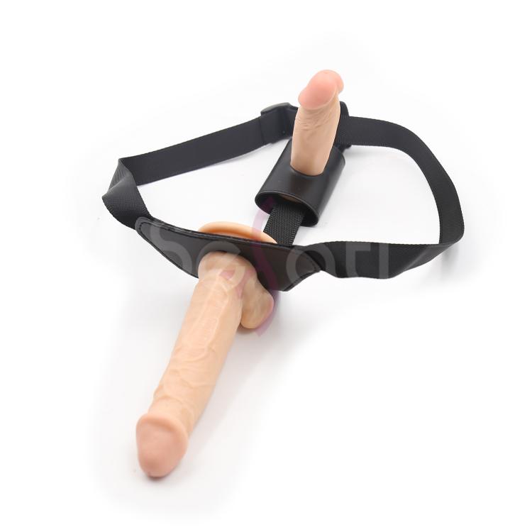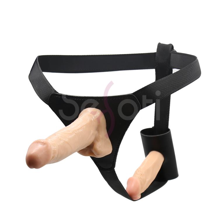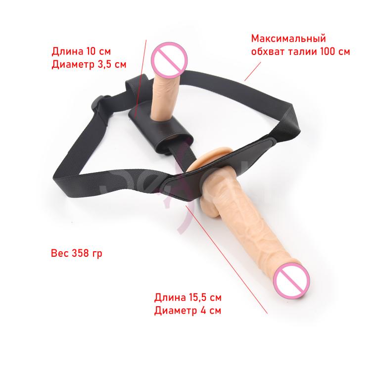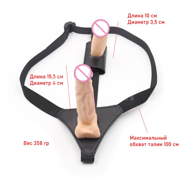 Двусторонний страпон специально для девушек, желающих попробовать себя в мужской роли, но и не забывают про свое удовольствие. Трусики отлично регулируются (до 100 см в объеме), нет лишних деталей, которые могут помешать процессу. Страпон включает в себя 2 фаллоимитатора - внешний (длина 15,5 см, диаметр 4 см) и внутренний (длина 10 см, диаметр 3,5 см). Внутренний фаллоимитатор можно расположить таким образом, чтобы он входил либо в анус, либо в вагину.
