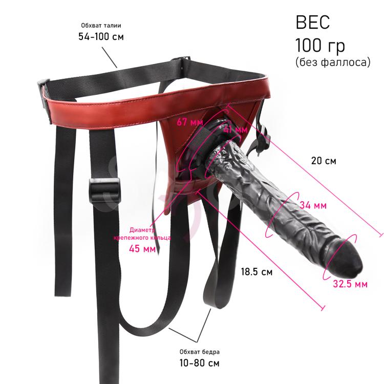 Страпон со съемным фаллоимитатором прекрасно подойдет для тех, кто желает разнообразить интимную жизнь, на время поменявшись ролями. Пояс для страпона сделан из красной экокожи, дополненной прочными черными ремнями, которые можно отрегулировать под любой размер бедер (54-100 см). Прекрасно держится на теле и не спадает даже во время активных поступательных и возвратных движений. Съемный фаллоимитатор идеального размера выполнен из высококачественного термопластичного эластомера, который является долговечным и гипоаллергенным. Выглядит очень реалистично - присутствует головка, венки и рельеф по всем стволу полового члена. Дилдо легко снимается с пояса, можно его заменить любым другим фаллоимитатором (с диаметром не более 4,4 см).