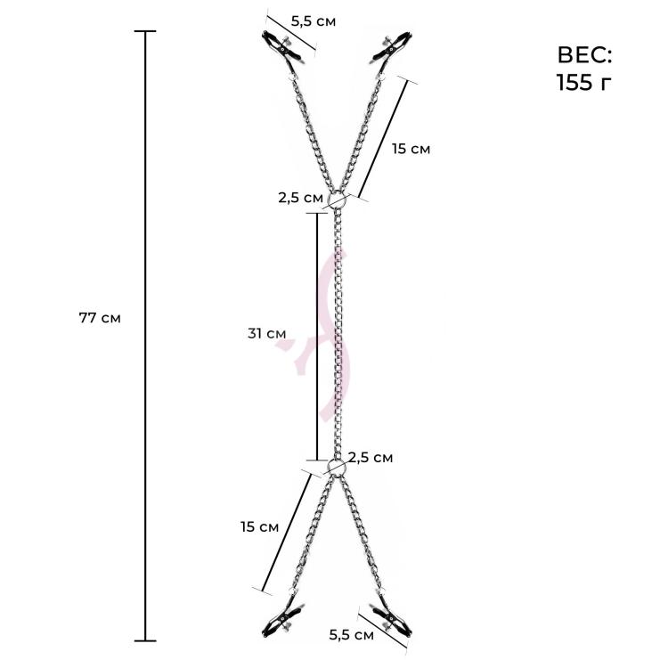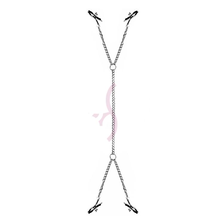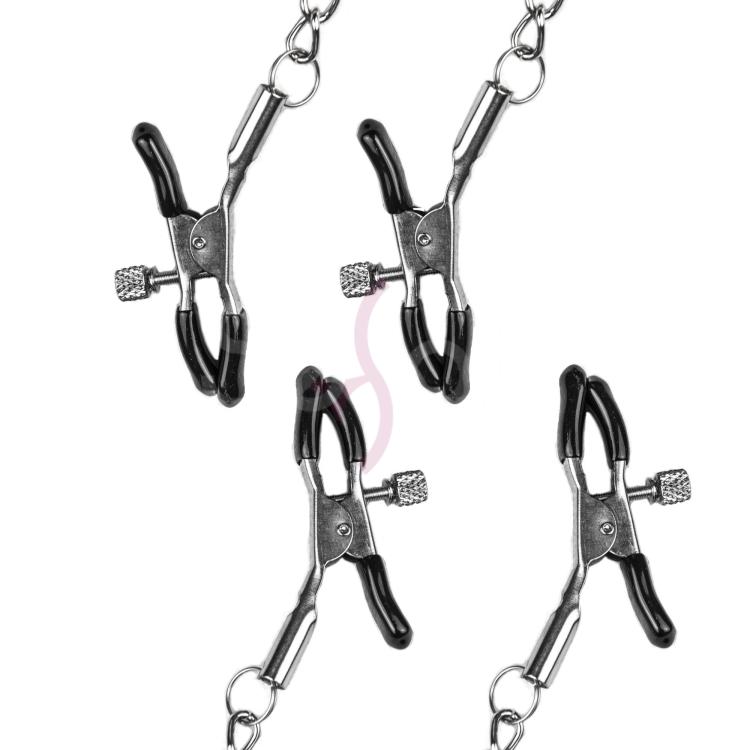 Зажимы для сосков - незаменимый аксессуар для БДСМ игр, который привнесет в вашу сексуальную жизнь разнообразие ощущений и море чувственных удовольствий. Секс-игрушка выполнена в виде прочных металлических цепей, соединенных между собой, а у них на концах расположены зажимы. Они сделаны из качественных материалов, имеют специальное покрытие для того, чтобы не травмировать нежную кожу сосков, клитора или мошонки. С таким интимным аксессуаром для садо-мазо можно придумать множество интересных практик, например соединиться друг с другом с помощью цепей, и это поможет вам сблизиться с партнером еще больше.